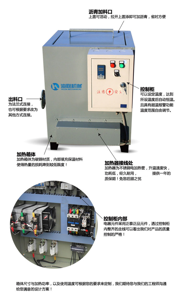 瀝青電加熱器具有加熱速度快、加熱均勻、環(huán)保等特點。具體加熱功率根據客戶需要定制。